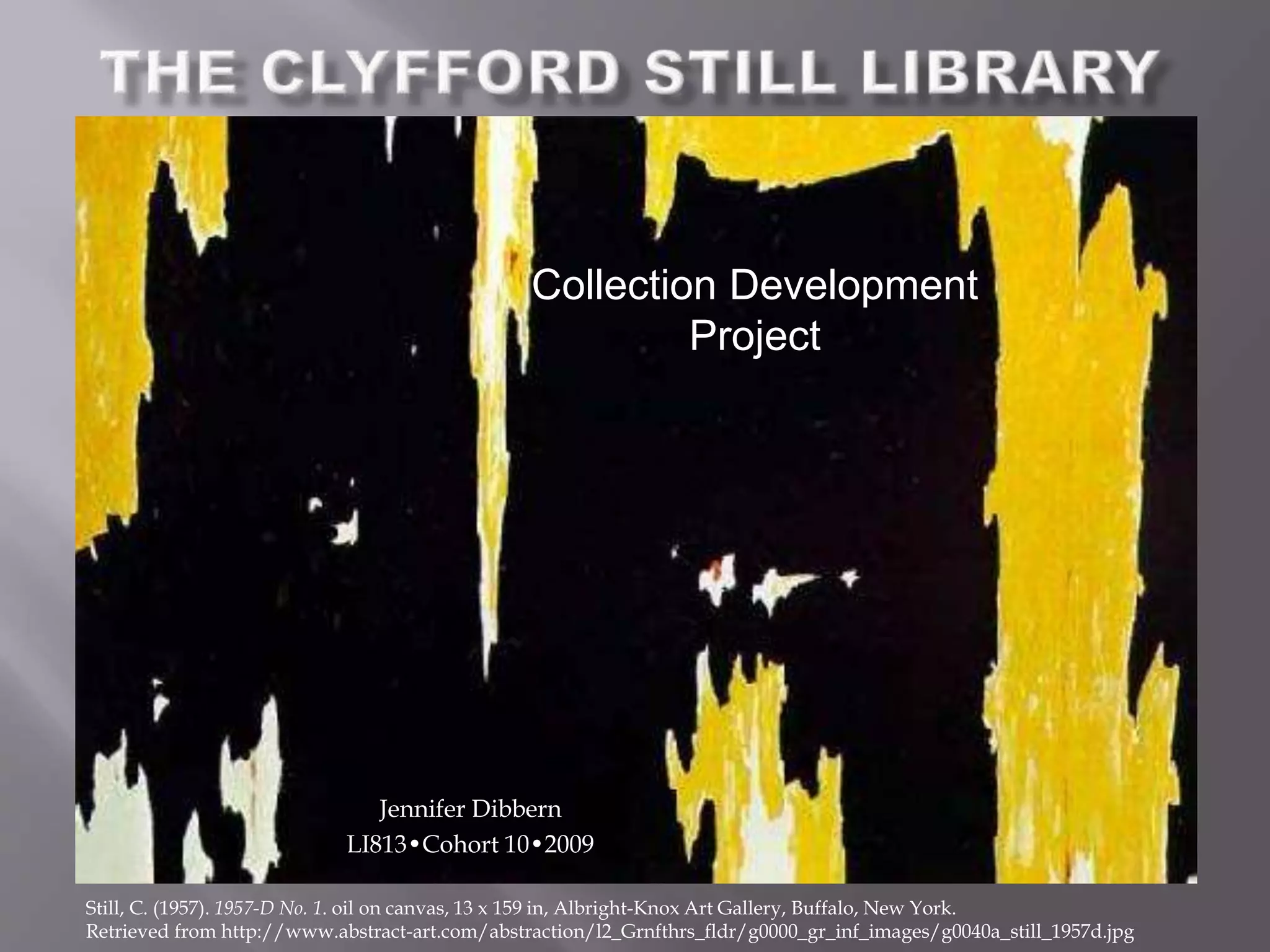 Jennifer Dibbern LI813•Cohort 10•2009 CollectionDevelopment Project Still, C. (1957). 1957-D No. 1. oil on canvas, 13 x 159 in, Albright-Knox Art Gallery, Buffalo, New York. Retrieved from http://www.abstract-art.com/abstraction/l2_Grnfthrs_fldr/g0000_gr_inf_images/g0040a_still_1957d.jpg