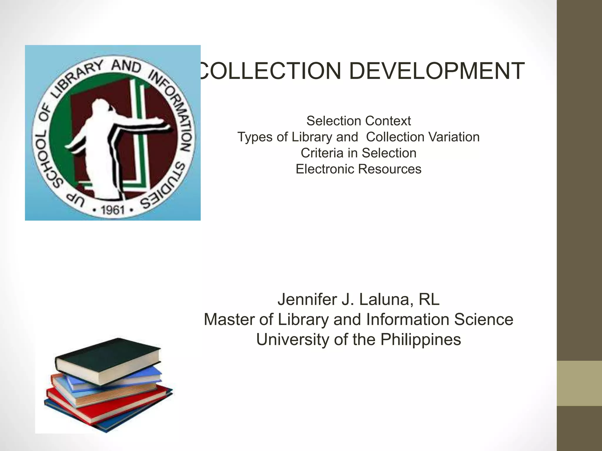This document discusses collection development in libraries. It begins by outlining the context of selection, including the types of libraries and how their collections vary. It then discusses criteria for selection, such as authority, scope, format, subject matter, and cost. It provides examples of criteria for selecting fiction, serials, multimedia resources, video recordings, graphic materials, and audio recordings. It also discusses the major components and depth of collections for different types of libraries like public, academic, school, and special libraries.