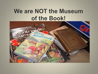 This document provides guidance on evaluating and weeding library collections. It discusses why collection evaluation and weeding are important to save time, space, and ensure access to current information. It outlines criteria for evaluating collections such as curriculum alignment, age analysis, and circulation data. Methods of analyzing collections are described, including using vendor analysis sites and circulation reports. Guidelines are presented for identifying materials to weed using criteria like being misleading, superseded, or trivial. Options for disposing of weeded materials include donating, book sales, or recycling. Safety and policy concerns are also addressed.