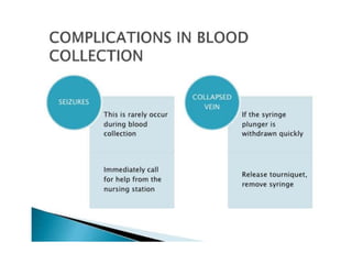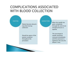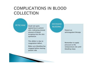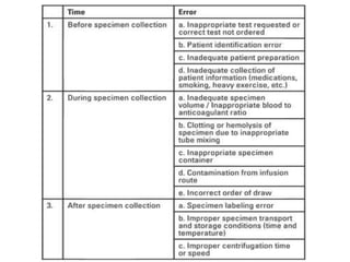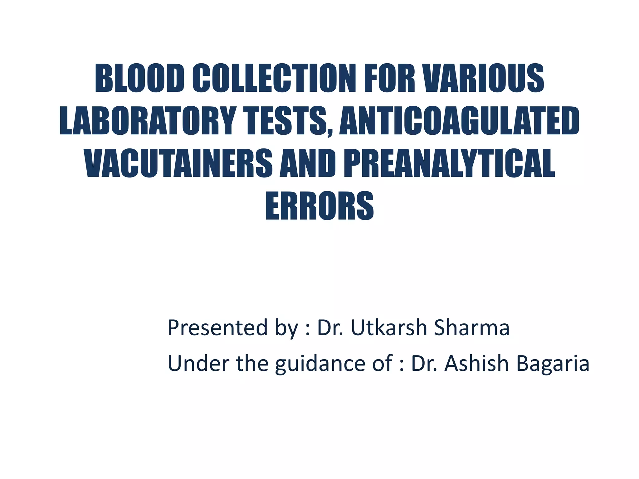 This document discusses blood collection for laboratory tests using anticoagulated vacutainers and sources of preanalytical errors. It describes the appropriate vacutainers and additives used for different tests like CBC, coagulation studies, chemistry etc. The sequence of filling different vacutainer tubes is explained. Common causes of preanalytical errors like hemolysis, lipemia, patient misidentification, and not following guidelines for mixing blood with additives are summarized. The importance of following standard operating procedures for collection, transport, and processing of specimens is highlighted to reduce preanalytical errors.