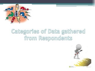 This document defines key terms related to data collection and research methods. It discusses what constitutes primary and secondary data, as well as the advantages of each. Primary data is gathered directly from original sources like individuals, groups, documents, and objects, while secondary data is collected from secondary sources like published books and articles. The document also outlines different categories of data that can be collected from respondents, including facts, attitudes, judgements, and test results. Finally, it lists several research instruments and tools that can be used to gather data, such as questionnaires, interviews, observations, and mechanical devices like microscopes.