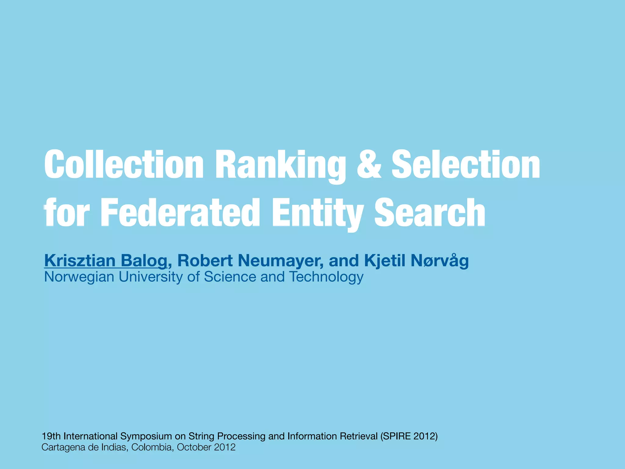 The document discusses collection ranking and selection methods for federated entity search, emphasizing the importance of entities in information retrieval. It introduces a novel method called AENN that combines collection-centric and entity-centric approaches to improve precision and recall in distributed search settings. Experimental results demonstrate that AENN outperforms standard baseline models by focusing on a name-based entity representation.