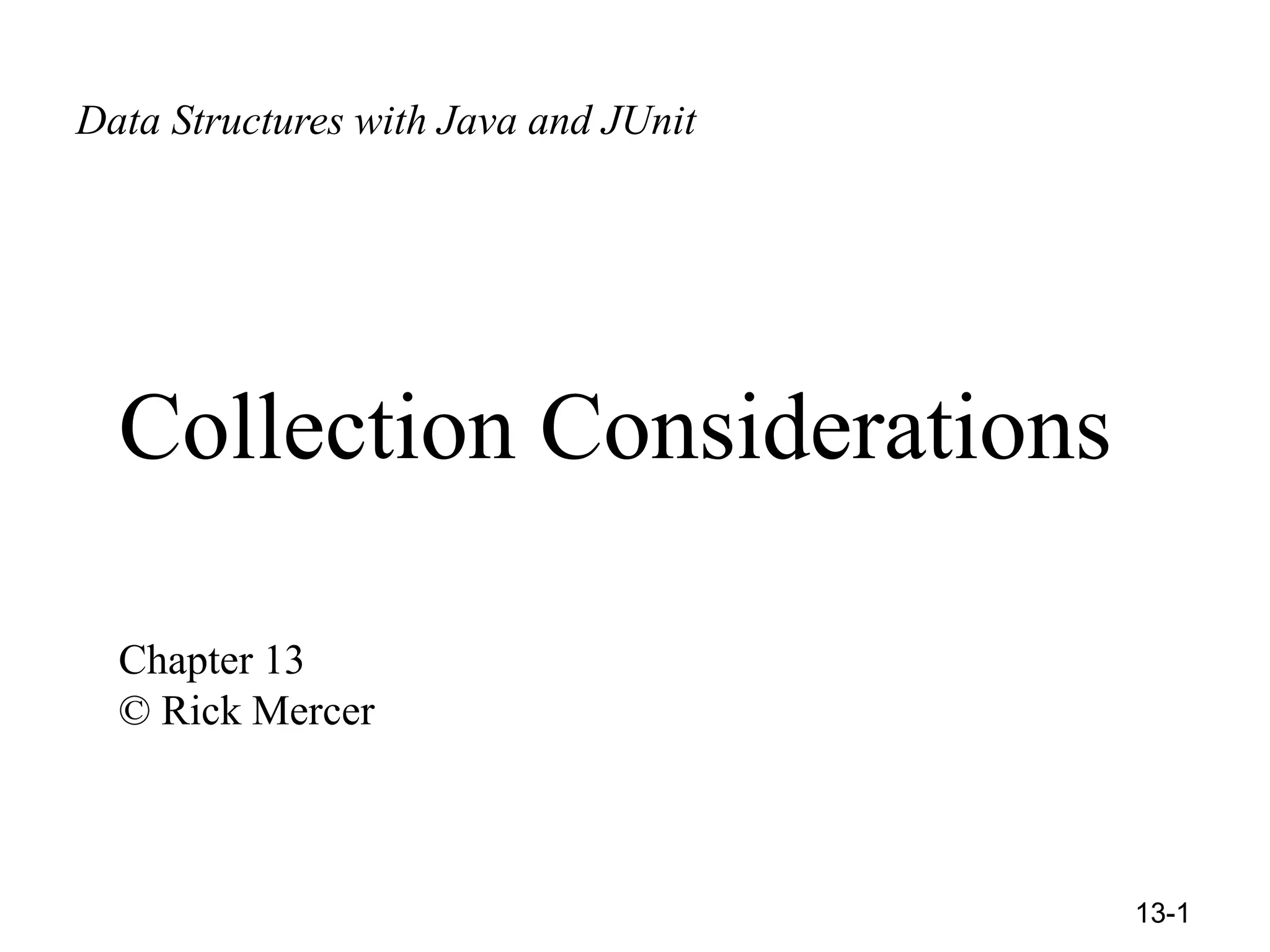 The document discusses various concepts in Java related to collection classes and data structures, focusing on the abstract data type of bags, their definitions, and common methods for data manipulation. It also covers Java interfaces, generics for type safety, and the idea of implementing comparable interfaces for custom object comparison. Key topics include the distinction between different collection structures, how to use generics, and the importance of type safety in Java collections.