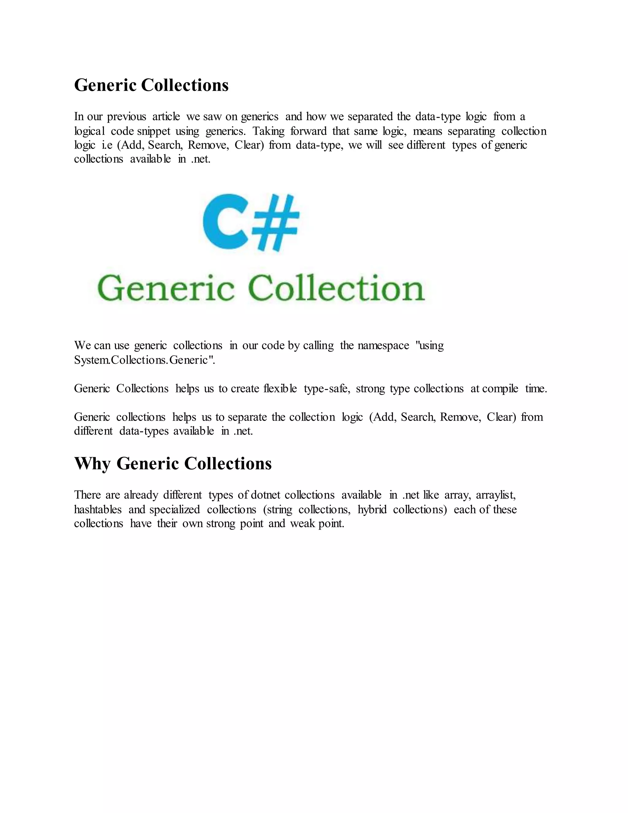 The document discusses generic collections in .NET. Generic collections allow type-safe, strongly typed collections by separating the collection logic (add, search, remove, clear) from the data type. This is done through generics, which were applied to existing .NET collections like lists, dictionaries, stacks and queues. The key benefits are that generic collections provide both the strong typing of arrays and the flexibility of resizing of collections like arraylists. Examples are provided of how to declare and use generic lists, dictionaries, stacks and queues with different data types in C#.
