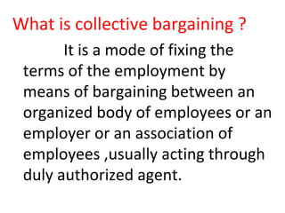 This document discusses collective bargaining in healthcare, labor laws, unions, and the role of nurse managers. It defines collective bargaining as negotiations between employers and employee representatives regarding working conditions and employment terms. The key aspects of collective bargaining covered include its characteristics, subjects of negotiation like wages and benefits, importance in promoting industrial peace, and types. The document also examines trade unions, their objectives and functions according to Indian labor law. Health care labor laws aim to provide benefits like maternity leave and accident compensation.