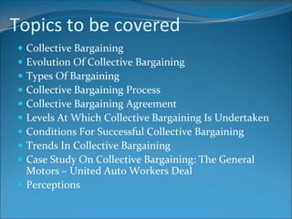 This document provides an overview of collective bargaining, including its definition, evolution, types, process, agreements, levels, conditions for success, trends, and perceptions. Collective bargaining is a negotiation process between labor unions and employers to determine wages, hours, rules and other conditions of employment. It aims to find common ground to reconcile conflicting interests through proposals and counterproposals. The key aspects covered include preparation, discussion, proposals, bargaining and settlement. [/SUMMARY]