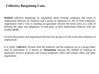 Collective bargaining is a process of negotiation between employer and employee representatives regarding terms of employment. It aims to reach mutually agreeable conditions through discussion and involves joint decision making between firms and workers. Collective bargaining operates at national, sectoral, and company levels and has importance for employees, employers, and society by promoting industrial peace and harmonious labor relations.