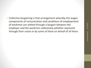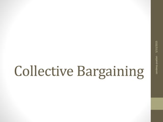 Collective bargaining is a process where wages, benefits, and employment conditions are negotiated by a group of workers, usually represented by a union, with their employer. It involves collective negotiation and compromise between workers and management to reach agreements on terms of employment. Some key aspects of collective bargaining are that it is carried out by groups rather than individuals, focuses on rule-making around employment terms, and aims to reach agreements through a cooperative process rather than confrontation.