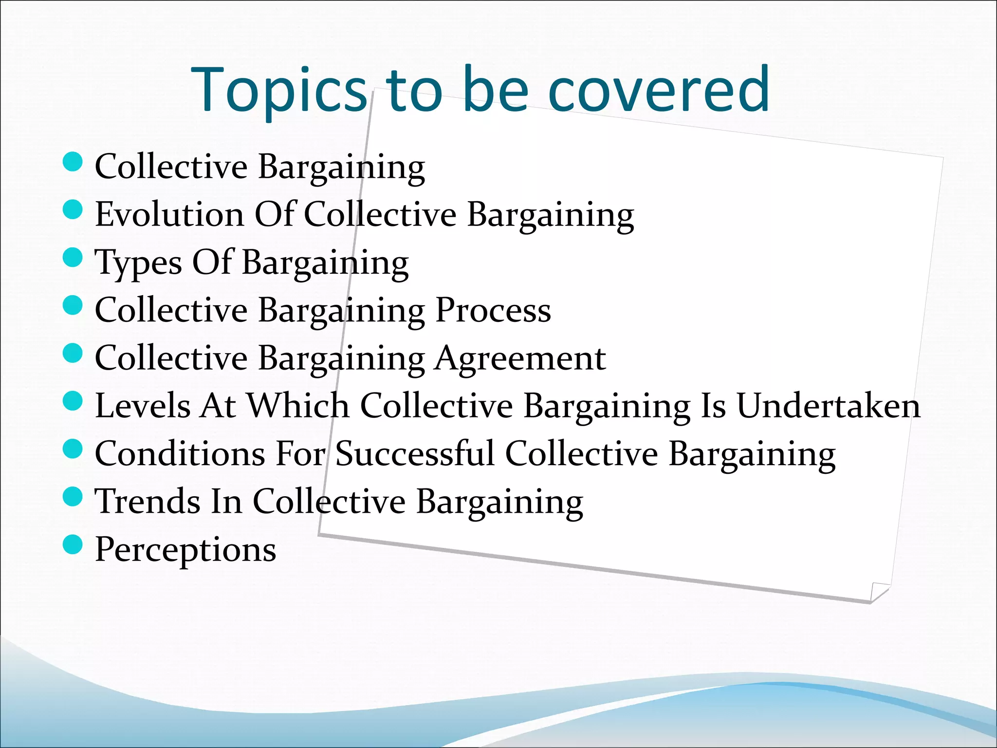This document discusses collective bargaining, including its definition, evolution, types, process, agreements, levels, conditions for success, and perceptions. Collective bargaining is a negotiation process between labor and management to determine contracts covering working conditions. It aims to reconcile conflicting interests through flexible discussions. Key aspects covered are the collective bargaining agreement, levels at which it occurs, and conditions like good faith that promote successful negotiations. Perceptions address its implementation, benefits, attitudes required, and importance of creating a win-win situation.
