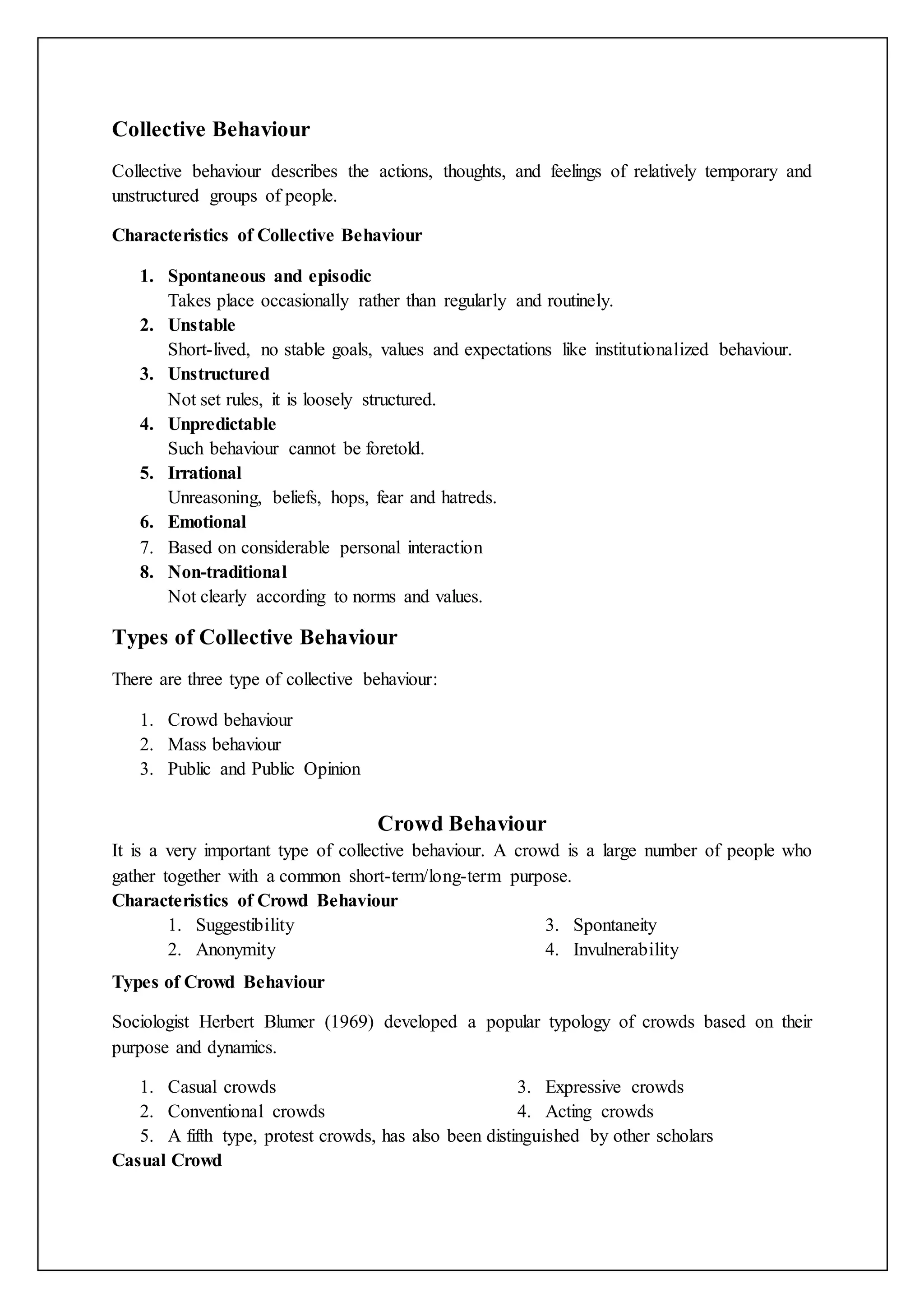 This document defines and describes different types of collective behavior, including crowd behavior and mass behavior. It identifies key characteristics of collective behavior like being spontaneous, unstable, unstructured, and emotional. The document then examines different types of crowds like casual crowds, conventional crowds, expressive crowds, and acting crowds. It also discusses riots, mass hysteria, rumors, panic, and fashion/fads as forms of mass behavior. Finally, it introduces the concept of public opinion and discusses contagion theory as an explanation for collective behavior.