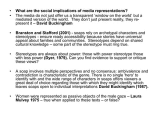 Collective identity refers to an individual's sense of belonging to a group through shared social activities like consuming media. While media representations present a view of reality, audiences can interpret messages actively and form their own identities. Theories suggest identity is constructed through social interactions rather than inherent, and media provide resources for self-reflection and choosing a lifestyle. Collective identities also form through online fan communities sharing interests in age, gender, culture and politics. Ultimately measuring collective identity is difficult as representations only have meaning through individual interpretation.