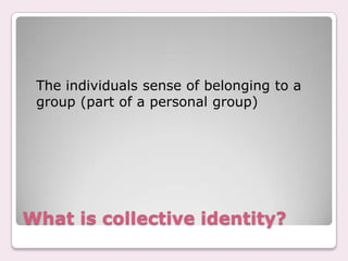 Collective identity refers to a shared sense of belonging to a group based on real or imagined attributes. It is a perception that may be constructed rather than directly experienced. Scholars debate whether collective identity is more a social construction imposed by outsiders rather than a true reflection of one's identity. The document discusses how young people's identities are often represented negatively in media through dominant images but they also create their own subcultures and collective identities through music, art, fashion and lifestyle choices. It tasks students to create a self-representation chart considering individual and collective identities as well as conscious choices of included and excluded images and their connotations.
