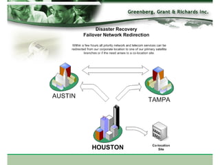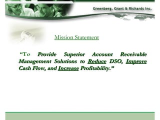 Greenberg, Grant & Richards is a collection agency that has been in business for 18 years. They employ experienced collectors across six US locations to aggressively pursue debt collection through expert negotiation and private investigators. Their goal is to provide superior client services by reducing DSO, improving cash flow, and increasing profitability for clients through their successful collection techniques and technology systems.