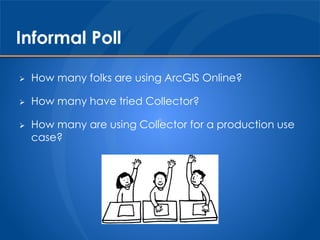 This document discusses using Collector for ArcGIS to enable field data collection and empower utility operations. Collector allows users to collect data using mobile devices and publish it to ArcGIS Online or Portal for use across the organization. While Collector currently only supports connected access, Esri is working on offline support which is not yet suitable for most utility workflows due to limitations like an inability to use dynamic map services. The document provides recommendations for implementing Collector, including publishing editable feature services and creating web maps for use in the app.
