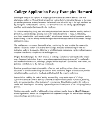 The document discusses the challenges of writing college application essays, particularly for prestigious schools like Harvard, emphasizing the importance of self-expression, humility, and a clear understanding of the institution's values. It also highlights the need for expert guidance in refining these essays to improve admission chances. Various themes such as personal narratives, the impact of chronic diseases on African American women, and other topics on literature and social issues are also briefly mentioned.