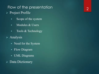 - An overview of the project including its scope, modules, users, and technologies used (PHP, MySQL, WAMP server).