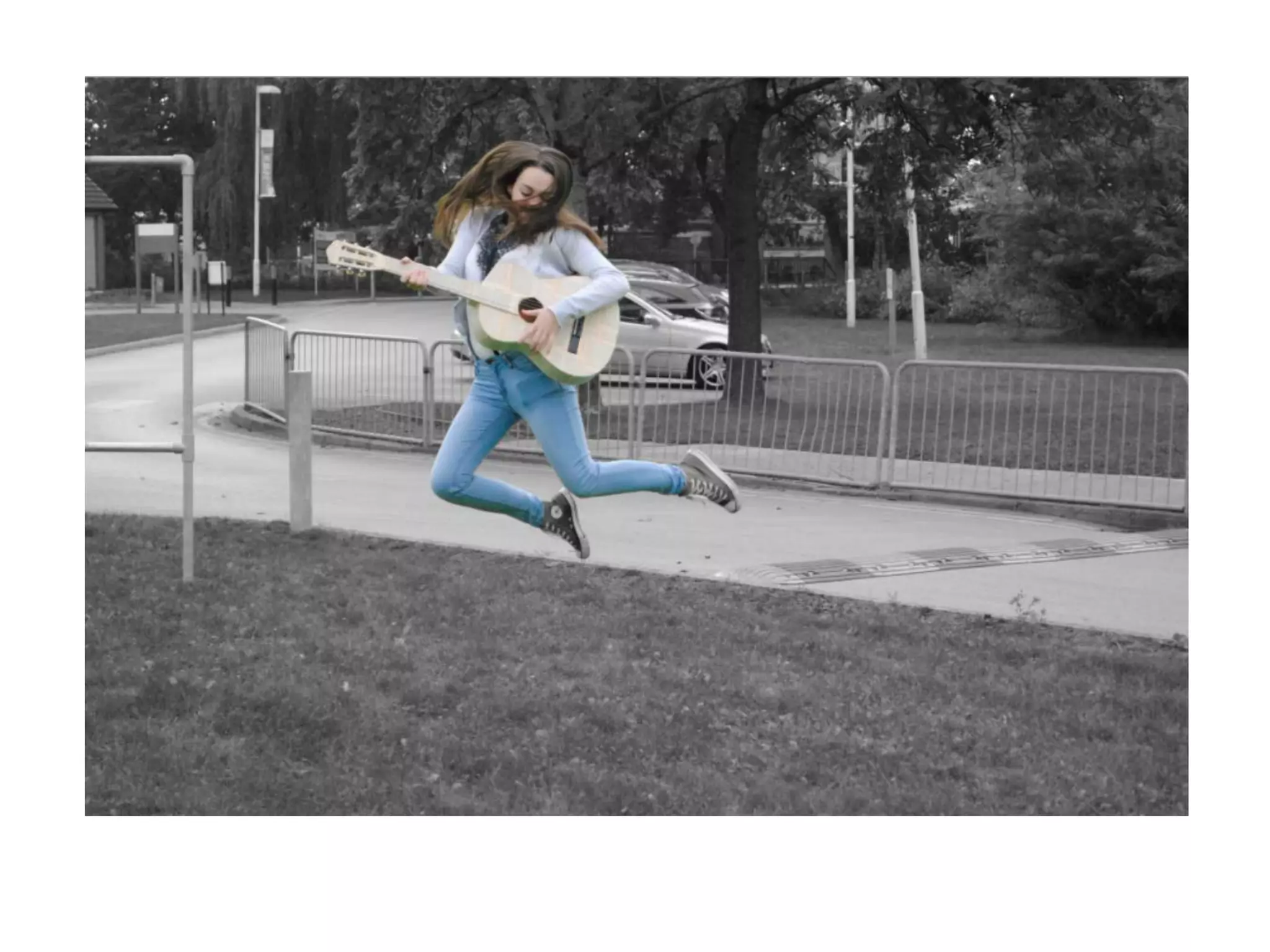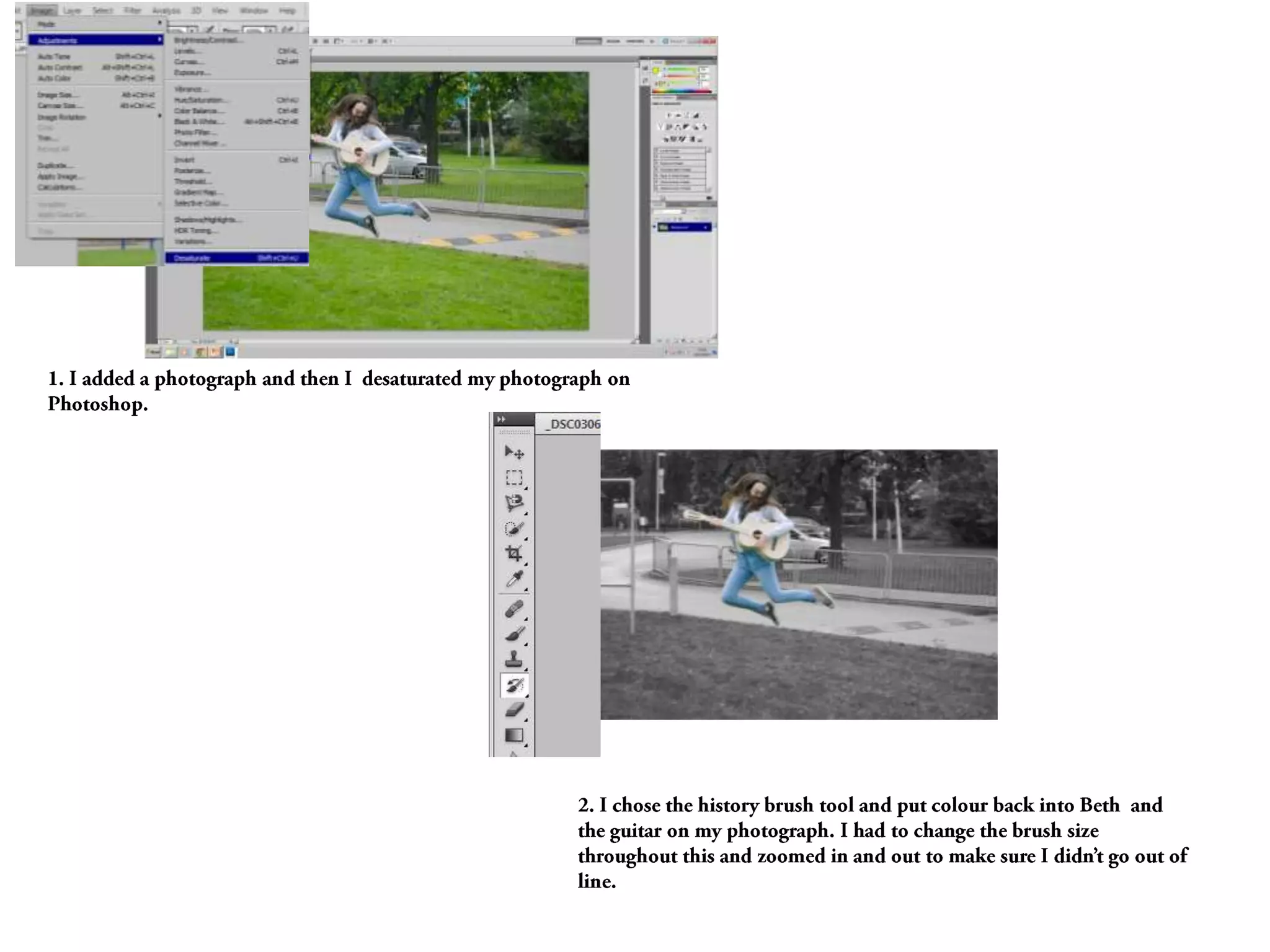 The document describes editing a photograph in several steps: applying a poster edges filter and adjusting its settings, applying a sumi-e filter and increasing exposure, desaturating the photo and adjusting brightness and contrast, and using the history brush tool to add color around the subject with a smaller brush size. The author notes they were experimenting with background colors and likes how the flowers look in purple rather than green.