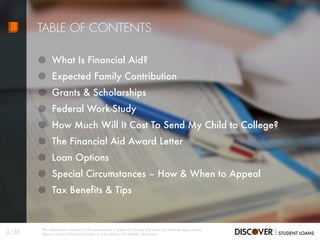 This presentation provides an overview of college financial aid, including types of financial aid such as grants, scholarships, and loans, along with application processes like the FAFSA. It explains the importance of early planning to determine expected family contributions and factors affecting financial aid eligibility. Additionally, it touches on award letters, loan options, and potential tax benefits associated with education expenses.