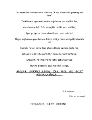 The document is a reflection on college life and missing the carefree days spent with friends in college. It lists various fond memories like attending classes, hanging out in hostels, studying together for exams at night, flirting with girls, and more. While life moves fast after college, the writer believes they will cherish those memories and friendships for life. The document ends by stating college life rocks and hopes to reunite with friends again someday.
