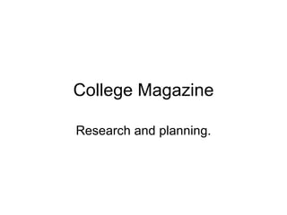 The document discusses planning and research for designing a college magazine. It provides examples of college magazine covers that were reviewed, including one that focuses on photos of students and campus life and another that focuses more on education and study tips. The document then outlines the development process for creating a magazine cover and contents page focused on studying for a magazine called "Study Break." This included selecting a photo, fonts, colors, and layout to appeal to college students and reflect the theme of studying.