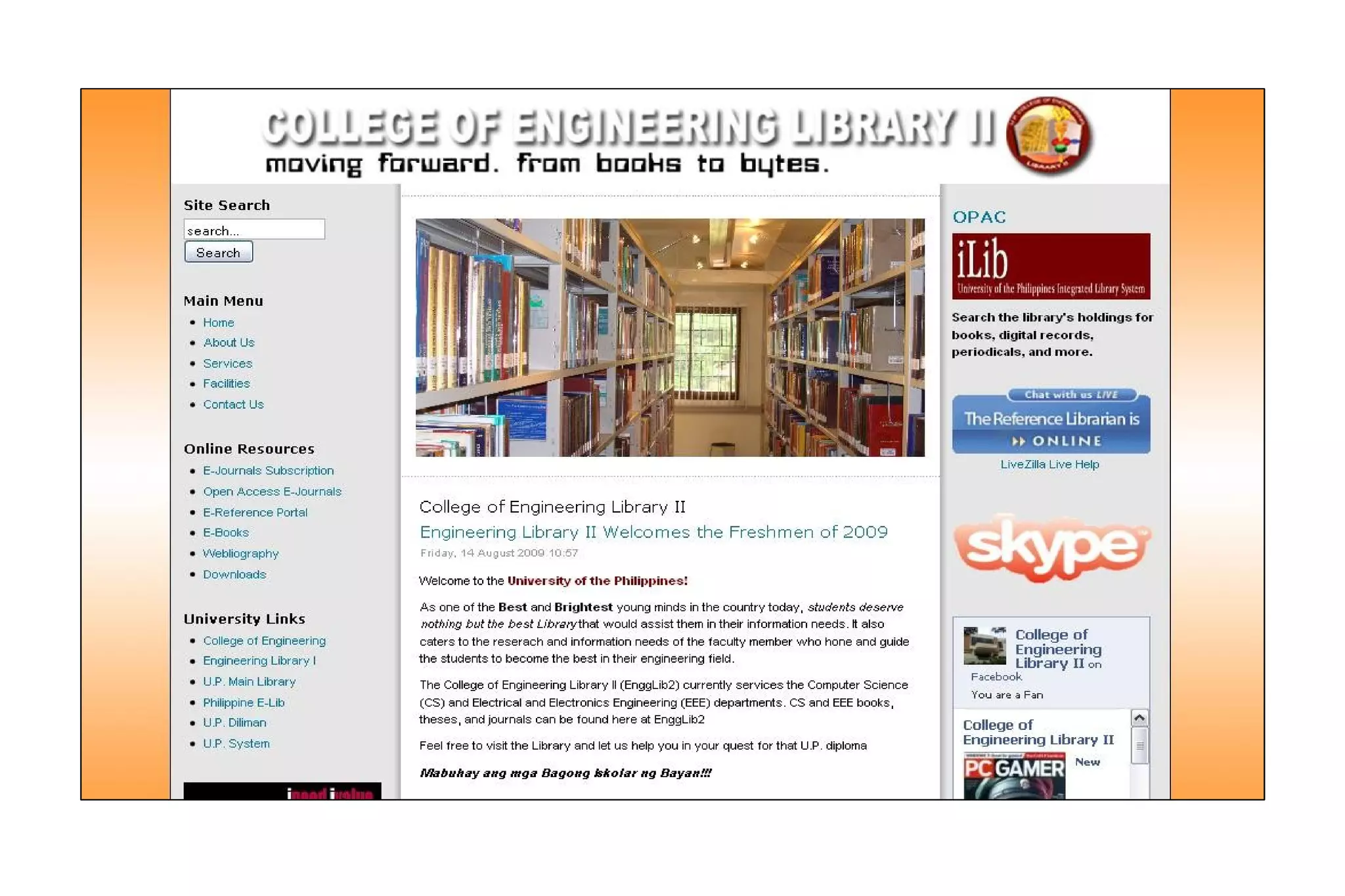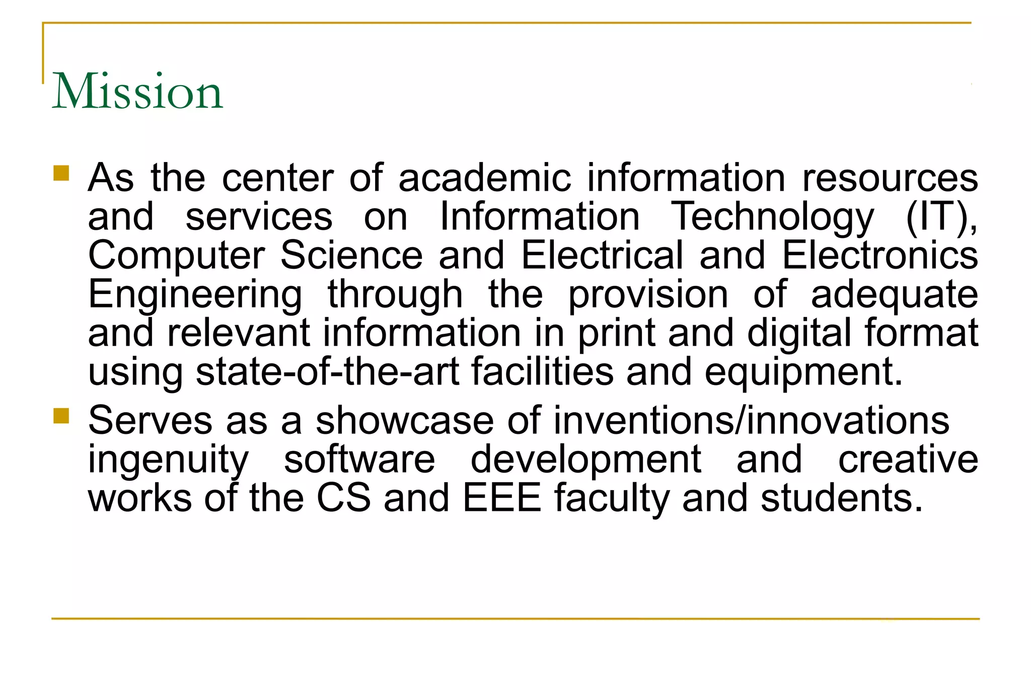 This document provides an orientation to the services and facilities of the UP College of Engineering Library II. It summarizes the library's mission to provide academic information resources in IT, computer science, and electrical and electronics engineering. It then outlines the library's services such as current awareness updates, document delivery, interlibrary loans, Wi-Fi access, and reference services. The document also describes the library's facilities including discussion rooms, an e-reference portal, reading areas, archives, and collections. It concludes by detailing the library's hours, user requirements and privileges, and fines.