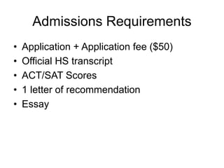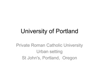The University of Portland is a private Roman Catholic university located in Portland, Oregon. It has an urban setting and requires applications, transcripts, ACT/SAT scores, a letter of recommendation, and essay for admission. Tuition is $36,700 per year for undergraduate students, with room and board costing an additional $10,700 per year. The university offers various specialty programs and student support services like campus ministry, health services, writing and math centers, and disability services. Student life includes dining, housing for about 60% of students, activities, athletics, international student services, and study abroad programs. Class sizes range from 10 to 90 students.