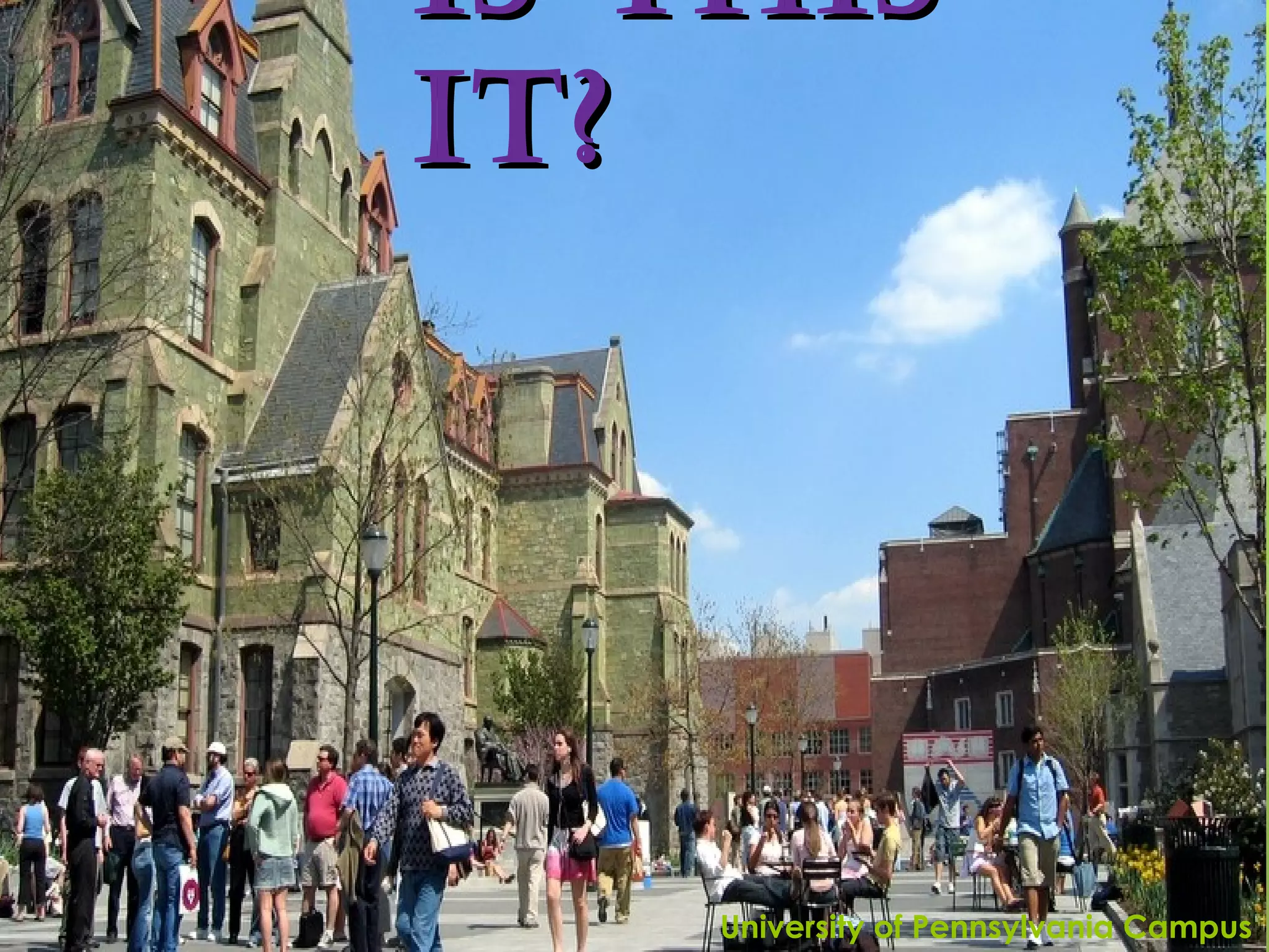 This document provides guidance to students on navigating high school and the college application process. It outlines important tasks and considerations for each year of high school, including choosing classes carefully, maintaining good grades, preparing for standardized tests, gaining experience through extracurriculars and community service, researching colleges, and starting the application process in junior and senior year. It also briefly describes different types of college campuses and settings.