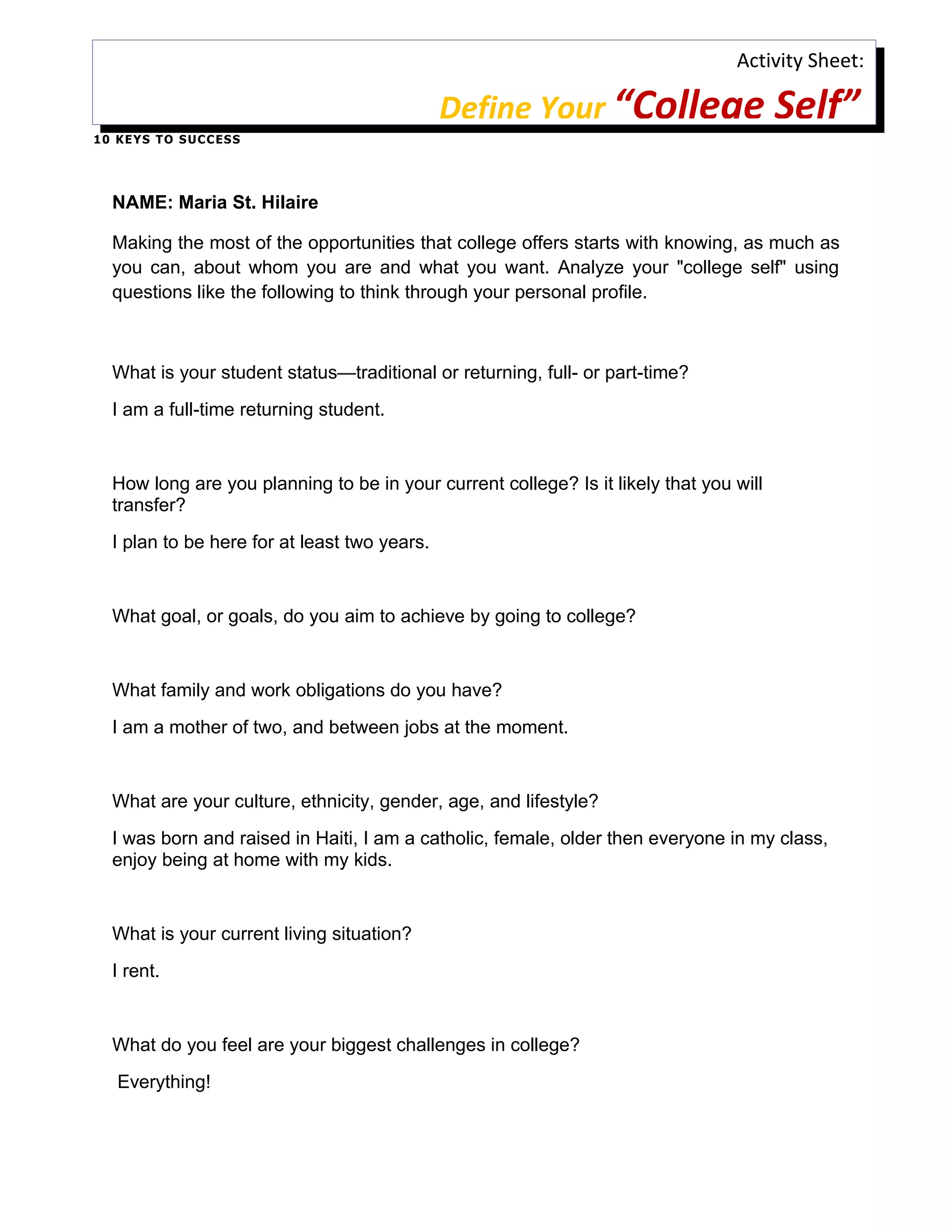 Maria St. Hilaire is completing an activity sheet to define her "college self" by answering questions about her student status, goals, obligations, background, living situation, challenges, and interests. She identifies herself as a full-time returning student planning to attend for at least two years. As a mother of two who is currently between jobs, her main obligations are to her family. She was born and raised in Haiti and enjoys spending time at home with her kids. Her biggest challenges will be balancing school with her family responsibilities as an older student new to the college environment. She is interested in studying psychology because she wants to help others and make a positive impact through that field of study.