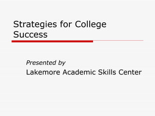 The document provides strategies for college success including getting organized with a weekly schedule, actively listening in class by sitting in the front and avoiding distractions, and excelling on exams by reviewing material throughout the week instead of cramming.