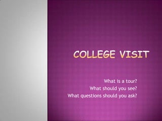 This document provides guidance on what to focus on and ask during a college tour. It recommends focusing on the sales pitch at the beginning, scouting areas to revisit, and asking the tour guide many questions. It then lists specific areas and facilities to see, such as grounds, buildings, construction, offices, athletic facilities, residence halls, social life areas, libraries, bookstores, health facilities, and dining halls. Finally, it provides sample questions for an interview, including why the interviewee wants to attend the school and what questions they have. The overall document aims to prepare students on what to prioritize and ask about during a college tour and interview.