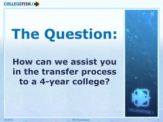 1) The document is an overview presentation about CollegeFish.org for Phi Theta Kappa members that assists students with the transfer process to a 4-year college.