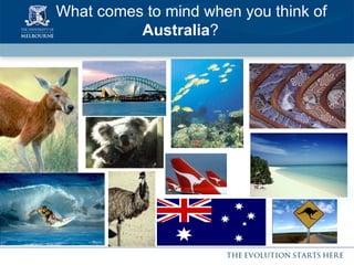 The document summarizes key information about studying at the University of Melbourne in Australia. It discusses the university's location in Melbourne, one of the world's most liveable cities. It also outlines the university's academic programs, support services for international students, admission requirements, estimated costs of attendance, and housing and lifestyle options for students.