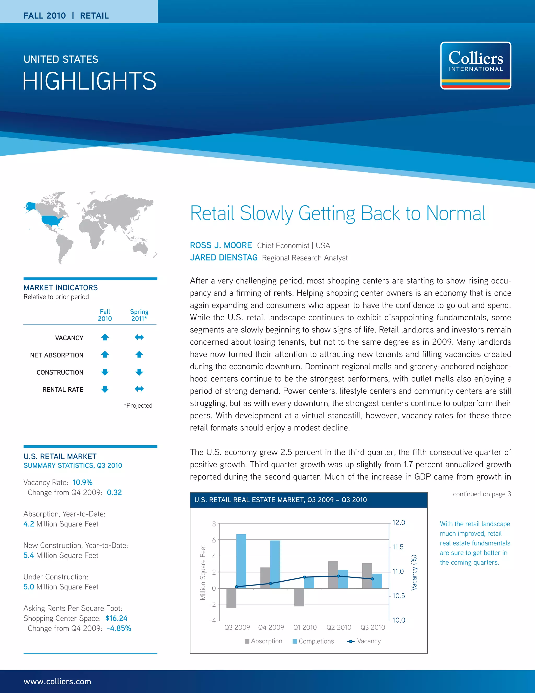 This document provides a summary of retail market conditions in the United States in Fall 2010. It finds that after a challenging period, most shopping centers are starting to show rising occupancy and stabilizing rents as the economy expands and consumer confidence increases. However, the retail landscape still exhibits disappointing fundamentals overall. Some segments like regional malls and grocery-anchored centers are performing better, while power centers and lifestyle centers continue struggling with high vacancy rates. With little new construction, vacancy rates may modestly decline for the weaker formats.