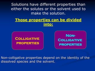 Colligative properties depend only on the number of dissolved particles in solution and not on their identity. The key colligative properties are vapor pressure lowering, boiling point elevation, and freezing point depression. Vapor pressure lowering occurs because solute particles decrease the number of solvent particles that can evaporate from the surface. Boiling point elevation and freezing point depression occur because adding solute particles lowers the vapor pressure of the solvent, requiring more energy for evaporation or freezing. The degree of change in boiling point or freezing point depends on the molality of the solution.