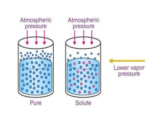 Colligative properties are properties of solutions that depend on the ratio of solute particles to solvent particles and not the chemical identity of the solute. The four main colligative properties are lowering of vapor pressure, elevation of boiling point, depression of freezing point, and osmotic pressure. These properties can be used to determine various solution characteristics like concentration but are more commonly used to understand phenomena like osmosis and melting ice on sidewalks for safety.