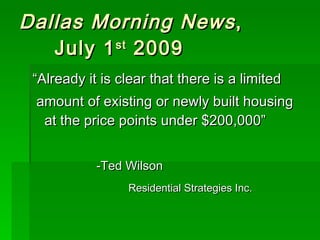 Starline Homes proposes to build affordable single-family homes in Collin County, Texas to meet growing demand. They plan to construct high-quality, energy efficient homes ranging from 1,000-2,000 square feet to blend into existing neighborhoods. Target cities like Allen, Celina and Frisco are experiencing growth while maintaining small town charm. Three specific projects are proposed: a 1,260 square foot home in Celina for $115,000; a similar home in Princeton for $117,000; and a community of four 1,500 square foot cottage-style homes in Allen priced from $185,000 to $200,000 each.