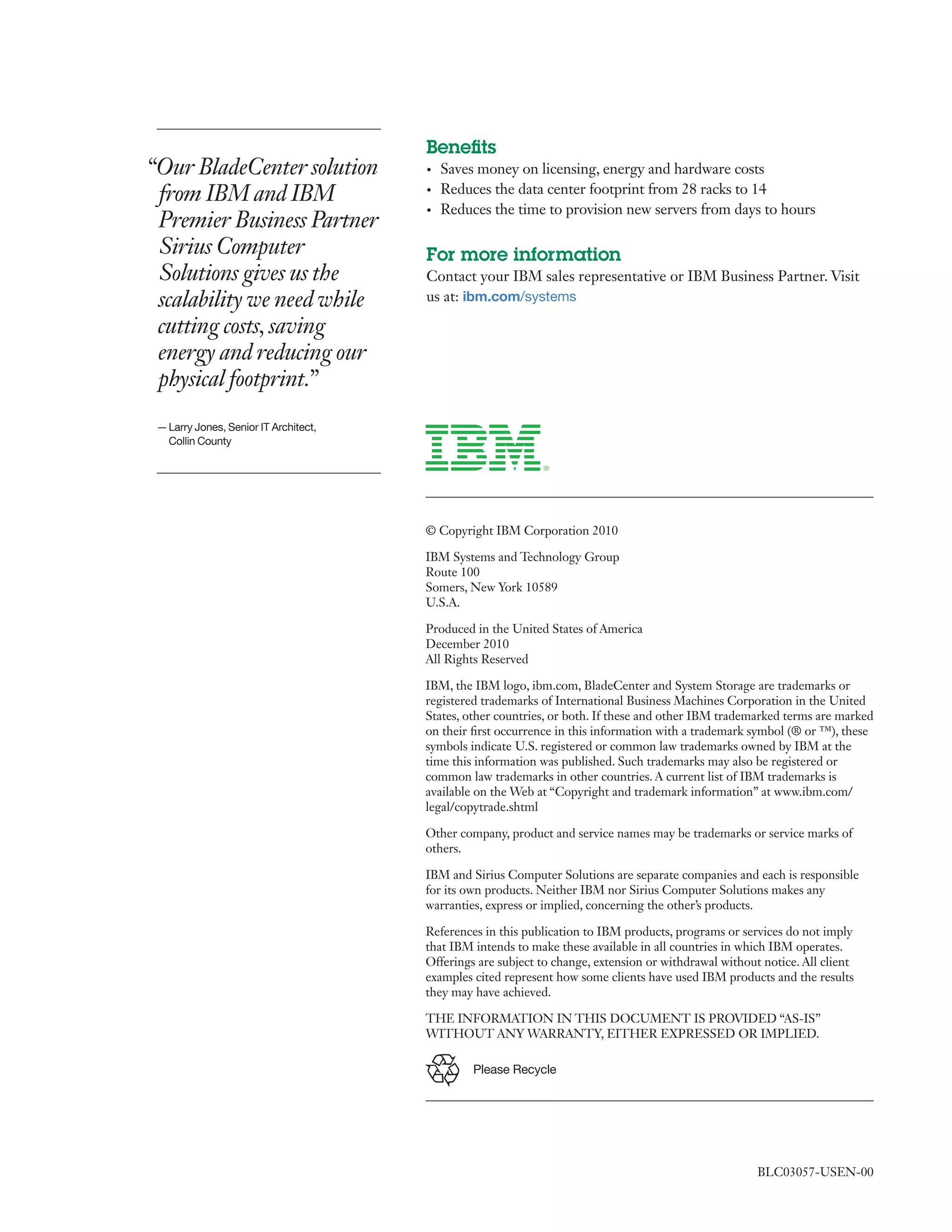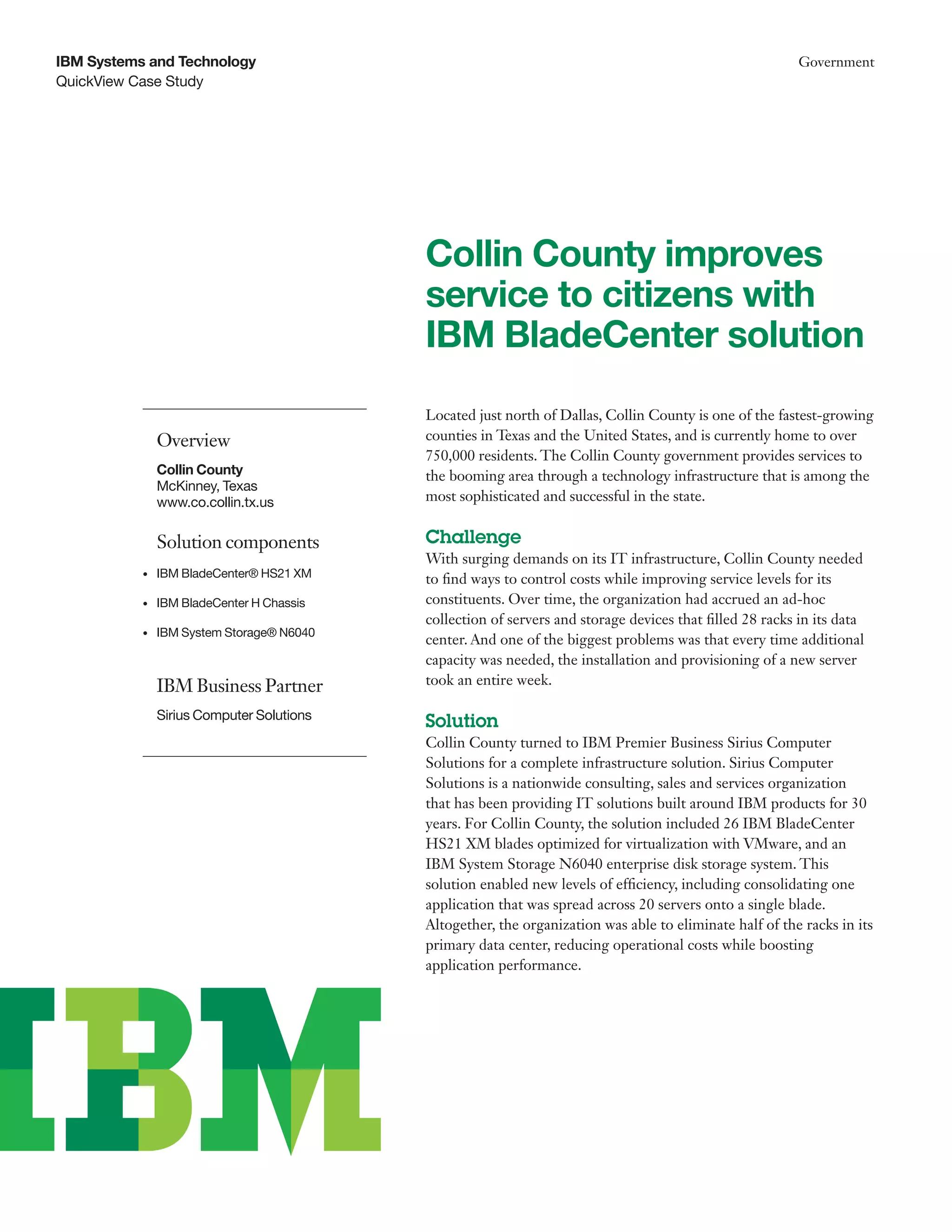 Collin County, Texas, faced challenges with its IT infrastructure due to surging demand and needed to improve service levels while controlling costs. By implementing an IBM BladeCenter solution with the help of Sirius Computer Solutions, the county consolidated its server setup, reducing its data center footprint from 28 racks to 14, and dramatically decreased server provisioning time from days to hours. This strategy not only saved money on licensing and energy costs but also enhanced application performance.