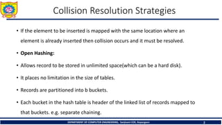 1) Separate chaining is an open hashing technique that uses linked lists to handle collisions. Each index in the hash table points to the head of a linked list of records with the same hash value.