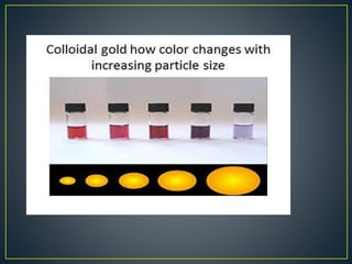 This document provides an overview of colloid science. It defines colloids as mixtures of two phases where one component is dispersed as nanometer- to micrometer-sized particles. The document then classifies and describes the structural characteristics of colloidal systems. It discusses several preparation and purification methods for colloids before explaining the stability of colloidal dispersions. The document concludes by outlining some common applications of colloids in areas like pharmaceuticals, cosmetics, paint, and rubber production.