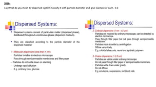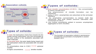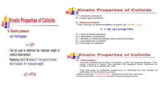 The document discusses colloidal systems, defining them as dispersions containing particles sized between 10Å to 2000Å. It covers the classification, properties, preparation, purification methods (such as dialysis and electrodialysis), and applications of colloids in fields like therapy and photography. Additionally, it explains the phenomena of Brownian motion, Tyndall effect, and the importance of electric charge in colloidal stability, as well as methods of preparing different types of colloids.