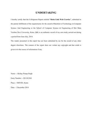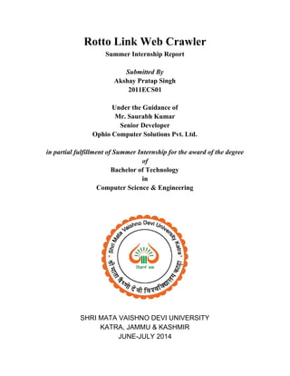 The document is a summer internship report by Akshay Pratap Singh detailing the development of a Rotto Link web crawler, aimed at identifying broken links within websites, as part of his Bachelor of Technology degree at Shri Mata Vaishno Devi University. The web crawler operates by taking a seed URL, analyzing hyperlinks, and storing results in a database while utilizing a Flask-based backend and an AngularJS frontend. The internship, conducted at Ophio Computer Solutions, focuses on enhancing web applications and providing tools to improve website maintenance through automated link checking.