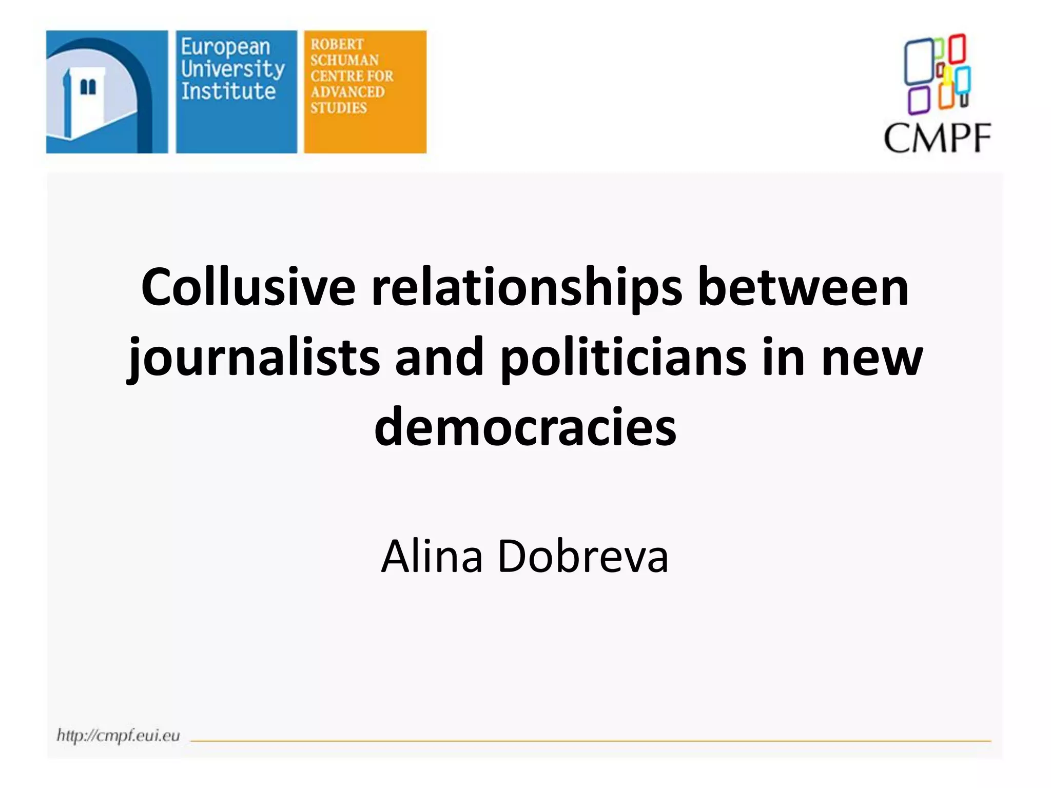 The document examines the symbiotic yet corrupt relationships between journalists and politicians in new democracies, specifically focusing on Bulgaria and Brazil. It highlights how media corruption is pervasive, influenced by political and economic interests, and often goes under-researched due to its complex, fuzzy nature. Suggested solutions include increasing transparency, ensuring financial independence of media, and strengthening professional practices to mitigate corruption.