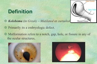 Coloboma is an embryologic ocular defect characterized by a gap or hole in ocular structures, with an incidence of 0.14% and typically bilateral occurrences. The classification of colobomas includes types based on location and completeness, with associated clinical features like visual field defects and retinal detachments being common complications. Treatment options vary depending on the severity and location of the defect, encompassing surgical interventions and management of associated conditions such as cataracts and retinal detachments.