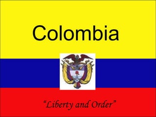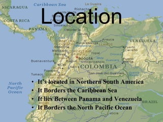 Colombia is located in northern South America between Panama and Venezuela. It has a diverse geography that includes mountains, rainforests, and coastlines. Colombia has a republic government system divided into executive, legislative, and judicial branches, with Bogota as its capital city. The economy relies on natural resources like oil, coal, and natural gas. Popular tourist destinations include Cartagena, Bogota, and areas along the Caribbean coast.