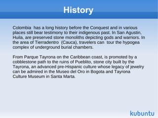 Colombia has a long history dating back before the Spanish conquest. Some indigenous ruins still exist today, such as stone monoliths and underground burial chambers. Colombia has experienced strong economic growth in recent decades but wealth is unequally distributed and poverty and unemployment remain issues. Colombian culture blends indigenous, Spanish, African and other influences. Some of Colombia's most emblematic cities are Bogota, Medellin, Cartagena, and Barranquilla, which are notable for their cultural offerings and festivals. Typical Colombian foods include bandeja paisa, tamales, sancocho, and cazuela. Famous Colombians include artist Fernando Botero, writer Gabriel Garcia Marquez,