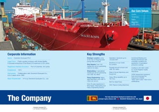 Colombo Dockyard PLC is a shipbuilding and ship repair company located in Sri Lanka. It has over 40 years of experience in ship repair, shipbuilding, and heavy engineering. It operates 4 drydocks up to 125,000 DWT and has the capabilities to build various types of vessels including passenger vessels, offshore support vessels, rescue and coast guard vessels, and harbour tugs. It also specializes in ship repairs for container carriers, bulk carriers, cement carriers, and tankers.