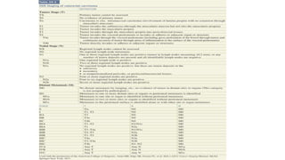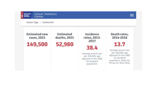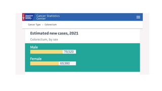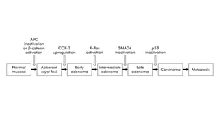 This document discusses colon cancer, including risk factors, pathogenesis, types of polyps, staging, and treatment. The main risk factors for colon cancer are age, personal history of colon cancer or inflammatory bowel disease, smoking, and obesity. Genetic defects like in the APC gene can cause familial adenomatous polyposis (FAP). Colon cancer is typically staged after diagnosis and treatment may involve surgery like colectomy along with chemotherapy and follow-up surveillance colonoscopies.