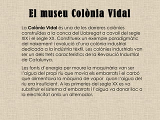 El museu ColòniaVidal La Colònia Vidal és una de les darreres colònies con s tru ï des a la conca del Llobregat a cavall del segle XIX i el segle XX. Constitueix un exemple paradigmàtic del naixement i evolució d’una colònia industrial dedicada a la indústria tèxtil. Les colònies industrials van ser un dels trets característics de la Revolució Industrial de Catalunya. Les fonts d’energia per moure la maquinària van ser l’aigua del propi riu que movia els embarrats i el carbó que alimentava la màquina de vapor quan l’aigua del riu era insuficient. A les primeries del segle XX es va substituir el sistema d’embarrats i l’aigua va donar lloc a la electricitat amb un alternador.
