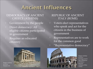 This document summarizes the origins and evolution of democratic forms of government from ancient Greece and Rome to developments in England that influenced democracy in North America. It outlines the shift from direct democracy in ancient Greece to representative democracy in Rome. Key documents that advanced democratic principles in England include the Magna Carta, Petition of Rights, English Bill of Rights, and philosophies of Locke, Montesquieu and Voltaire. Colonial governments in North America incorporated elements of self-governance seen in documents like the Mayflower Compact.