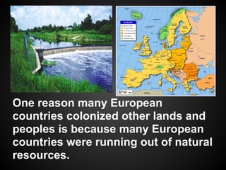 European countries colonized other lands in the 1500s due to lack of natural resources and overpopulation in Europe. This led to the colonization of the Americas by countries like England, France, Portugal, and Spain. However, the colonization had horrific consequences like genocide of the native Americans and introduction of African slavery. The European colonization of the Americas was one of the bloodiest times in human history due to death, slavery, and displacement of peoples that occurred.